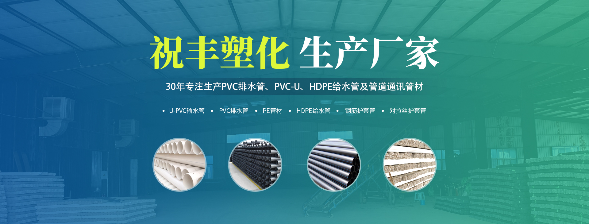 安陽市祝豐塑化有限公司坐落在滑縣工業(yè)園區(qū),東臨大廣高速,西臨京珠高速,是鄭州、鶴壁、安陽、濮陽四個城市的輸紐,交通便利、環(huán)境優(yōu)美。       公司始建于八十年代,經(jīng)過二十余年的艱辛創(chuàng)業(yè),規(guī)模不斷壯大,由十多萬元資產(chǎn)的小廠,發(fā)展到現(xiàn)占地面積達一萬多平,建筑面積一萬平,資產(chǎn)2000多萬元管材生產(chǎn)企業(yè)。公司生產(chǎn)PVC-U、PVC排水管、HDPE給水管、鋼筋護套管管道通訊管材等產(chǎn)品,廣泛用于農(nóng)田節(jié)水、高山引水、人畜用水、建筑、電力通訊等多種用途,品種齊全。為了滿足用戶需求,可承攬各種給水、節(jié)水、灌溉工程。“祝豐塑化”憑借強勁的實力,優(yōu)良的管理水平。“以質(zhì)量求生存,以信譽求發(fā)展”的原則全力以赴和大家共同塑造美好未來。..